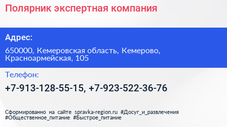 Полярник, экспертная компания по адресу 650000, Кемеровская область, Кемерово, Красноармейская, 105 в дальнейшем Организация, размещена в следующих категориях: