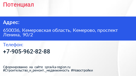Потенциал по адресу 650036, Кемеровская область, Кемерово, проспект Ленина, 90/2 в дальнейшем Организация, размещена в следующих категориях: