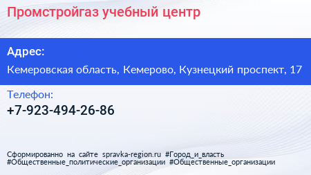 Промстройгаз, учебный центр по адресу Кемеровская область, Кемерово, Кузнецкий проспект, 17 в дальнейшем Организация, размещена в следующих категориях: