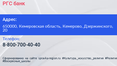 РГС банк по адресу 650000, Кемеровская область, Кемерово, Дзержинского, 20 в дальнейшем Организация, размещена в следующих категориях: