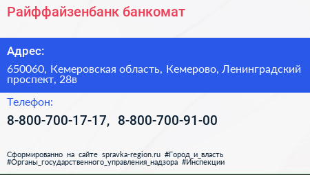 Райффайзенбанк, банкомат по адресу 650060, Кемеровская область, Кемерово, Ленинградский проспект, 28в в дальнейшем Организация, размещена в следующих категориях: