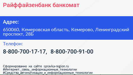 Райффайзенбанк, банкомат по адресу 650060, Кемеровская область, Кемерово, Ленинградский проспект, 28Б в дальнейшем Организация, размещена в следующих категориях: