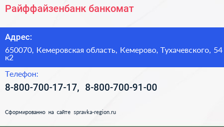 Райффайзенбанк, банкомат по адресу 650070, Кемеровская область, Кемерово, Тухачевского, 54 к2 в дальнейшем Организация, размещена в следующих категориях:
