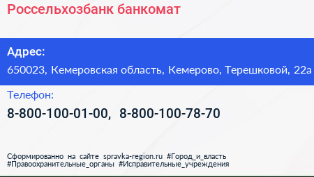 Россельхозбанк, банкомат по адресу 650023, Кемеровская область, Кемерово, Терешковой, 22а в дальнейшем Организация, размещена в следующих категориях:
