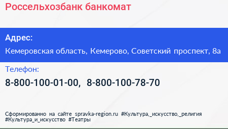 Россельхозбанк, банкомат по адресу Кемеровская область, Кемерово, Советский проспект, 8а в дальнейшем Организация, размещена в следующих категориях: