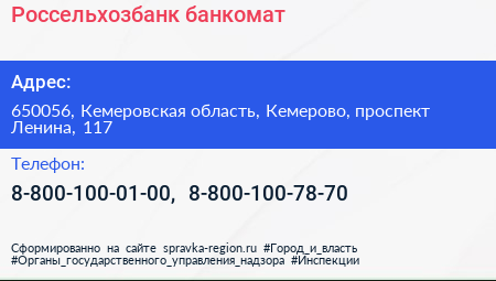 Россельхозбанк, банкомат по адресу 650056, Кемеровская область, Кемерово, проспект Ленина, 117 в дальнейшем Организация, размещена в следующих категориях: