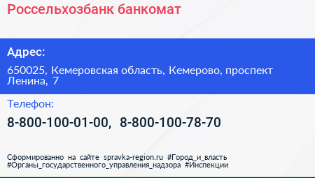 Россельхозбанк, банкомат по адресу 650025, Кемеровская область, Кемерово, проспект Ленина, 7 в дальнейшем Организация, размещена в следующих категориях: