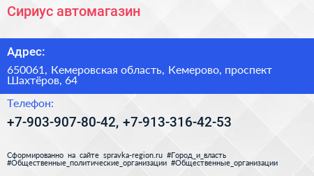 Сириус, автомагазин по адресу 650061, Кемеровская область, Кемерово, проспект Шахтёров, 64 в дальнейшем Организация, размещена в следующих категориях: