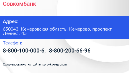 Совкомбанк по адресу 650043, Кемеровская область, Кемерово, проспект Ленина, 45 в дальнейшем Организация, размещена в следующих категориях: