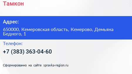Тамкон по адресу 650000, Кемеровская область, Кемерово, Демьяна Бедного, 1 в дальнейшем Организация, размещена в следующих категориях: