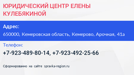 ЮРИДИЧЕСКИЙ ЦЕНТР ЕЛЕНЫ КУЛЕБЯКИНОЙ по адресу 650000, Кемеровская область, Кемерово, Арочная, 41а в дальнейшем Организация, размещена в следующих категориях: