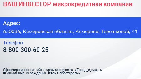 ВАШ ИНВЕСТОР, микрокредитная компания по адресу 650036, Кемеровская область, Кемерово, Терешковой, 41 в дальнейшем Организация, размещена в следующих категориях: