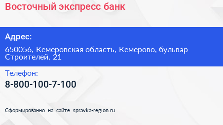 Восточный экспресс банк по адресу 650056, Кемеровская область, Кемерово, бульвар Строителей, 21 в дальнейшем Организация, размещена в следующих категориях: