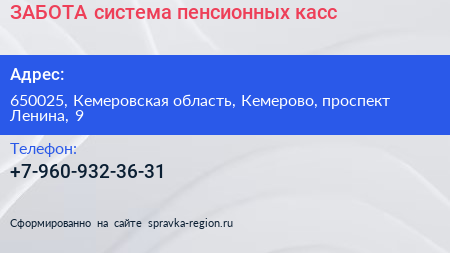 ЗАБОТА, система пенсионных касс по адресу 650025, Кемеровская область, Кемерово, проспект Ленина, 9 в дальнейшем Организация, размещена в следующих категориях: