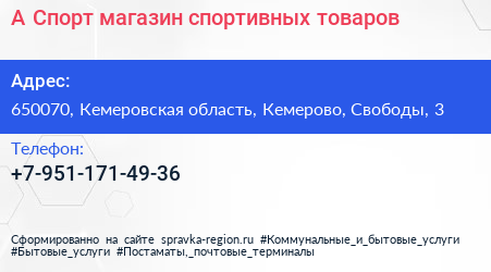 А-Спорт, магазин спортивных товаров по адресу 650070, Кемеровская область, Кемерово, Свободы, 3 в дальнейшем Организация, размещена в следующих категориях:
