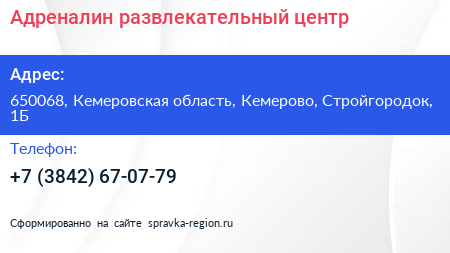 Адреналин, развлекательный центр по адресу 650068, Кемеровская область, Кемерово, Стройгородок, 1Б в дальнейшем Организация, размещена в следующих категориях: