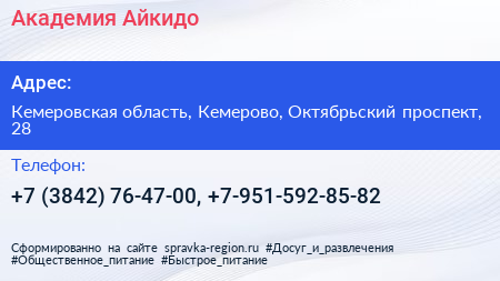 Академия Айкидо по адресу Кемеровская область, Кемерово, Октябрьский проспект, 28 в дальнейшем Организация, размещена в следующих категориях: