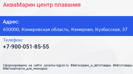 АкваМарин, центр плавания по адресу 650000, Кемеровская область, Кемерово, Кузбасская, 37 в дальнейшем Организация, размещена в следующих категориях: