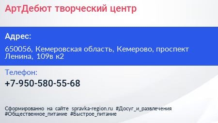 АртДебют, творческий центр по адресу 650056, Кемеровская область, Кемерово, проспект Ленина, 109в к2 в дальнейшем Организация, размещена в следующих категориях: