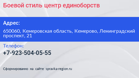 Боевой стиль, центр единоборств по адресу 650060, Кемеровская область, Кемерово, Ленинградский проспект, 21 в дальнейшем Организация, размещена в следующих категориях:
