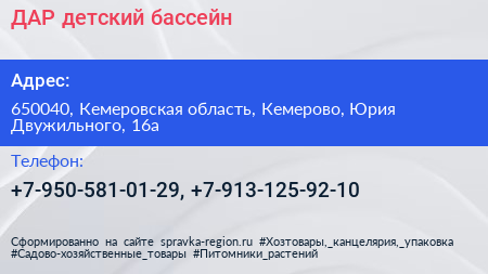 ДАР, детский бассейн по адресу 650040, Кемеровская область, Кемерово, Юрия Двужильного, 16а в дальнейшем Организация, размещена в следующих категориях: