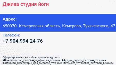 Джива, студия йоги по адресу 650070, Кемеровская область, Кемерово, Тухачевского, 47 в дальнейшем Организация, размещена в следующих категориях:
