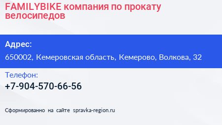 FAMILYBIKE, компания по прокату велосипедов по адресу 650002, Кемеровская область, Кемерово, Волкова, 32 в дальнейшем Организация, размещена в следующих категориях: