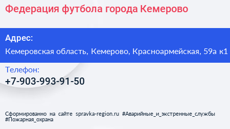 Федерация футбола города Кемерово по адресу Кемеровская область, Кемерово, Красноармейская, 59а к1 в дальнейшем Организация, размещена в следующих категориях: