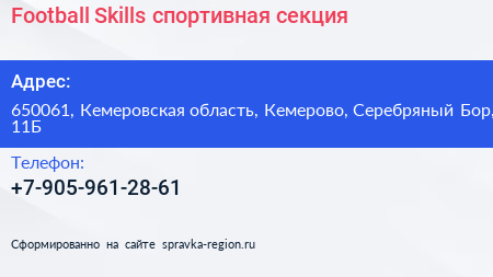 Football Skills, спортивная секция по адресу 650061, Кемеровская область, Кемерово, Серебряный Бор, 11Б в дальнейшем Организация, размещена в следующих категориях: