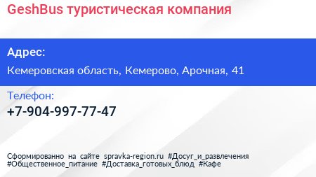 GeshBus, туристическая компания по адресу Кемеровская область, Кемерово, Арочная, 41 в дальнейшем Организация, размещена в следующих категориях: