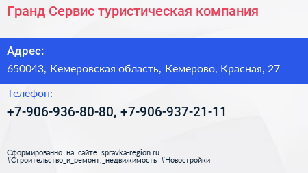 Гранд-Сервис, туристическая компания по адресу 650043, Кемеровская область, Кемерово, Красная, 27 в дальнейшем Организация, размещена в следующих категориях: