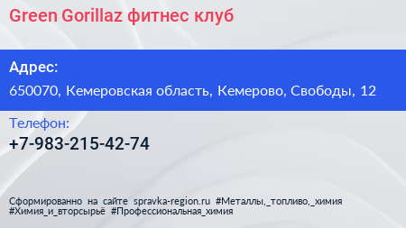 Green Gorillaz, фитнес-клуб по адресу 650070, Кемеровская область, Кемерово, Свободы, 12 в дальнейшем Организация, размещена в следующих категориях: