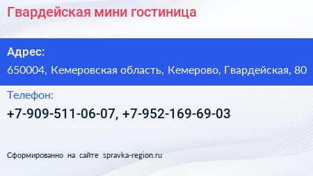 Гвардейская мини-гостиница по адресу 650004, Кемеровская область, Кемерово, Гвардейская, 80 в дальнейшем Организация, размещена в следующих категориях: