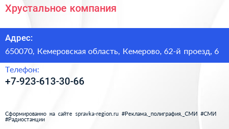 Хрустальное, компания по адресу 650070, Кемеровская область, Кемерово, 62-й проезд, 6 в дальнейшем Организация, размещена в следующих категориях: