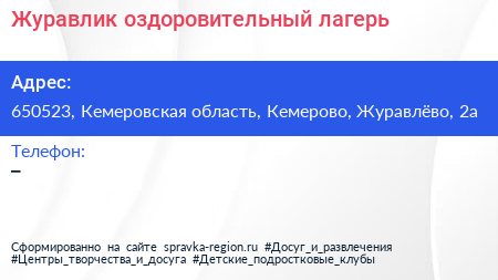 Журавлик, оздоровительный лагерь по адресу 650523, Кемеровская область, Кемерово, Журавлёво, 2а в дальнейшем Организация, размещена в следующих категориях: