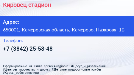 Кировец, стадион по адресу 650001, Кемеровская область, Кемерово, Назарова, 1Б в дальнейшем Организация, размещена в следующих категориях: