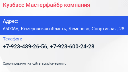 Кузбасс Мастерфайбр, компания по адресу 650066, Кемеровская область, Кемерово, Спортивная, 28 в дальнейшем Организация, размещена в следующих категориях: