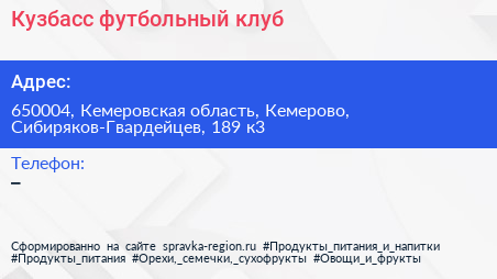 Кузбасс, футбольный клуб по адресу 650004, Кемеровская область, Кемерово, Сибиряков-Гвардейцев, 189 к3 в дальнейшем Организация, размещена в следующих категориях: