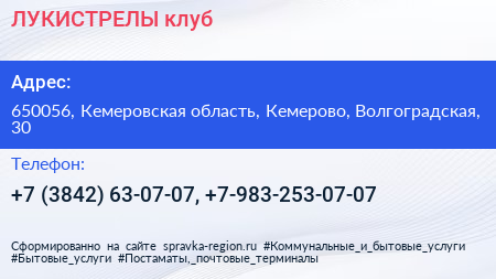 ЛУКИСТРЕЛЫ, клуб по адресу 650056, Кемеровская область, Кемерово, Волгоградская, 30 в дальнейшем Организация, размещена в следующих категориях: