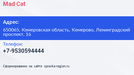 Mad Cat по адресу 650065, Кемеровская область, Кемерово, Ленинградский проспект, 16 в дальнейшем Организация, размещена в следующих категориях:
