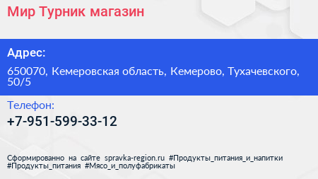 Мир Турник, магазин по адресу 650070, Кемеровская область, Кемерово, Тухачевского, 50/5 в дальнейшем Организация, размещена в следующих категориях: