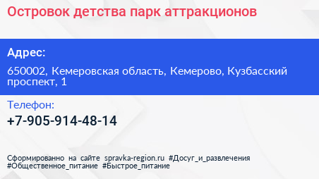 Островок детства, парк аттракционов по адресу 650002, Кемеровская область, Кемерово, Кузбасский проспект, 1 в дальнейшем Организация, размещена в следующих категориях: