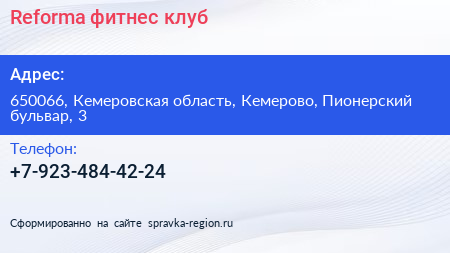 Reforma, фитнес-клуб по адресу 650066, Кемеровская область, Кемерово, Пионерский бульвар, 3 в дальнейшем Организация, размещена в следующих категориях: