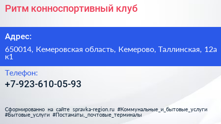 Ритм, конноспортивный клуб по адресу 650014, Кемеровская область, Кемерово, Таллинская, 12а к1 в дальнейшем Организация, размещена в следующих категориях: