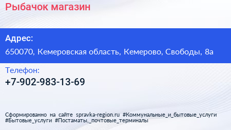 Рыбачок, магазин по адресу 650070, Кемеровская область, Кемерово, Свободы, 8а в дальнейшем Организация, размещена в следующих категориях: