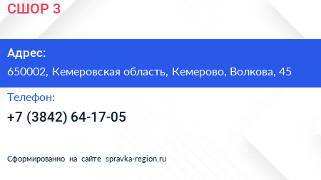 СШОР №3 по адресу 650002, Кемеровская область, Кемерово, Волкова, 45 в дальнейшем Организация, размещена в следующих категориях: