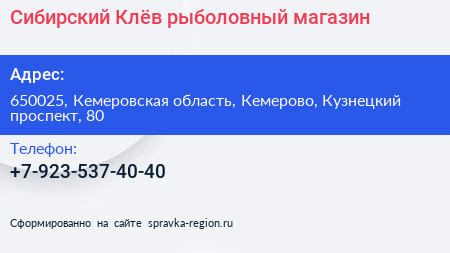 Сибирский Клёв, рыболовный магазин по адресу 650025, Кемеровская область, Кемерово, Кузнецкий проспект, 80 в дальнейшем Организация, размещена в следующих категориях: