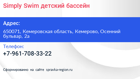 Simply Swim, детский бассейн по адресу 650071, Кемеровская область, Кемерово, Осенний бульвар, 2а в дальнейшем Организация, размещена в следующих категориях: