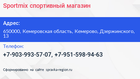 Sportmix, спортивный магазин по адресу 650000, Кемеровская область, Кемерово, Дзержинского, 13 в дальнейшем Организация, размещена в следующих категориях: