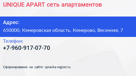 UNIQUE APART, сеть апартаментов по адресу 650000, Кемеровская область, Кемерово, Весенняя, 7 в дальнейшем Организация, размещена в следующих категориях: